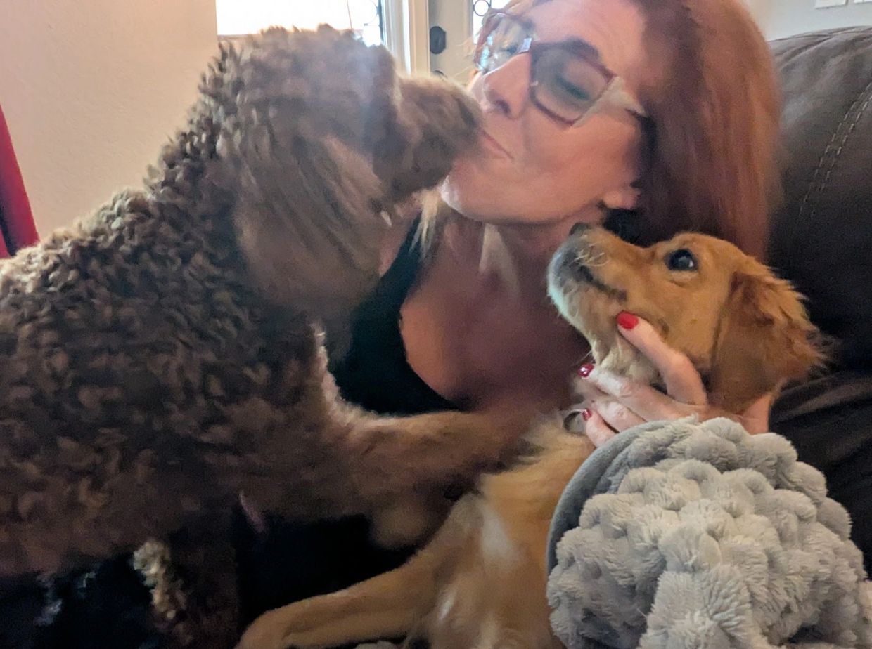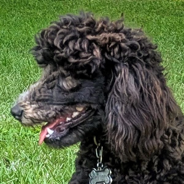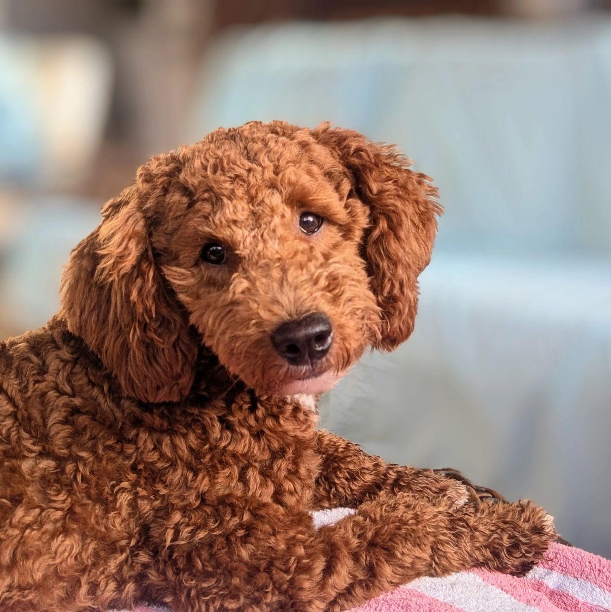 Maggie Mae is the mom of our current litter (9/23/25). She is a 2 years old Flat Coat Multi-generation Mini Golden Doodle